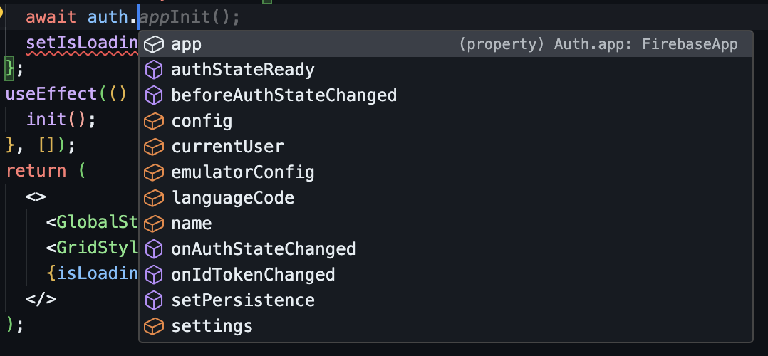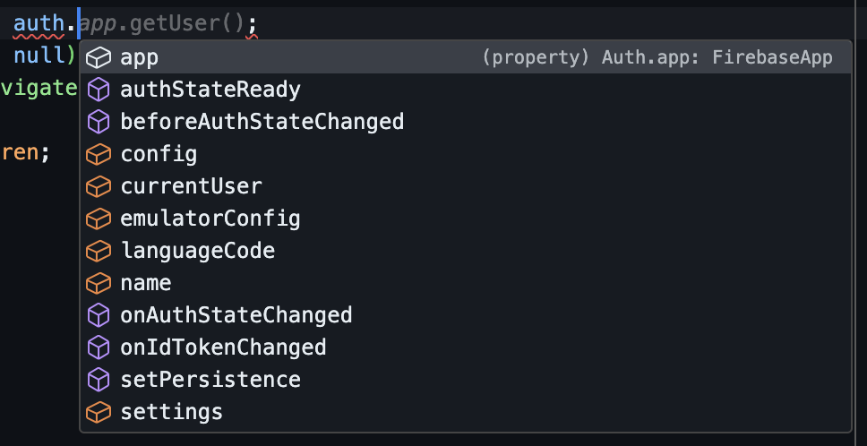 await를 하고 firebase.ts에서 정의한 auth를 불러온 다음 .(dot)을 찍으면 엄청 많은 것들이 보여질 것이다.