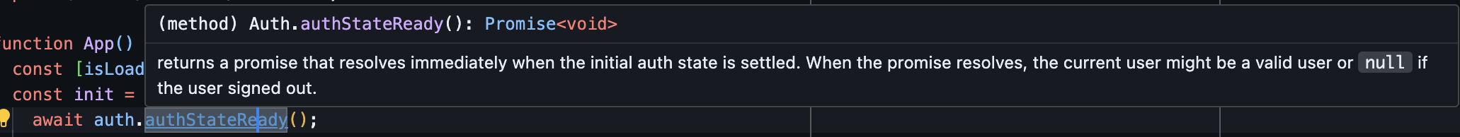우리가 할 일은 인증 상태가 준비되었는지를 기다리는 것인데, authStateReady는 최초 인증 상태가 완료될 때 실행되는 Promise를 return한다.