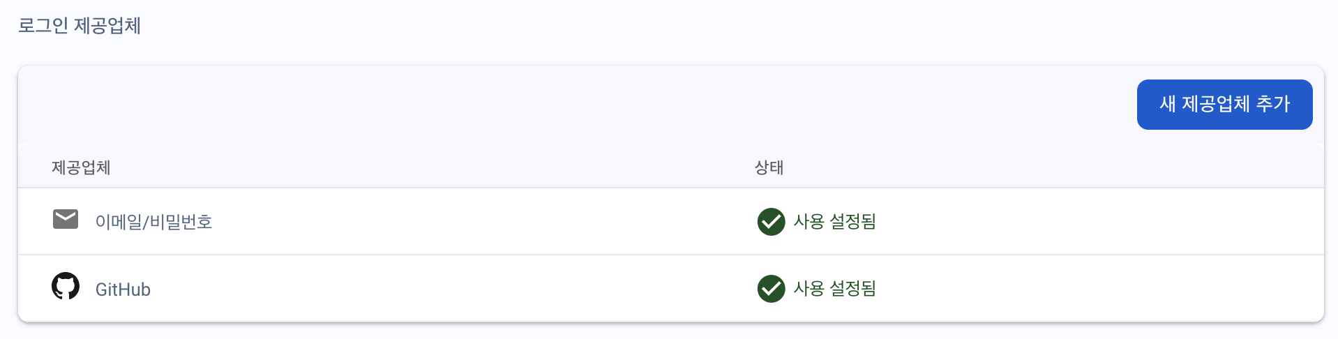 콘솔 메뉴에서 sign-in method를 클릭하고, Add new provider(새 제공업체 추가)를 한 후 github를 선택하자!