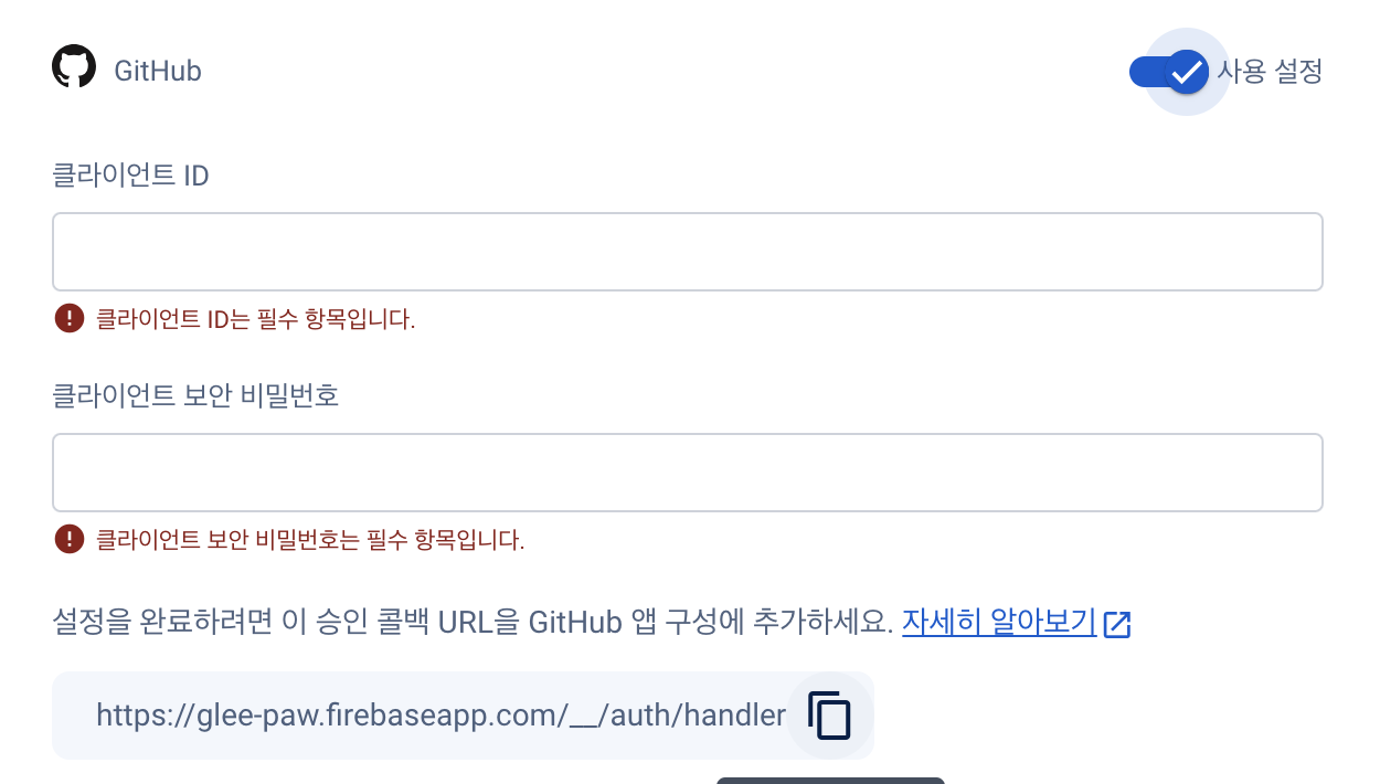 이메일, 비밀번호 가입과 마찬가지로 Firebase 콘솔에서 먼저 해당 기능을 등록한 후 우리 프로젝트 코드에 추가해주면 된다.