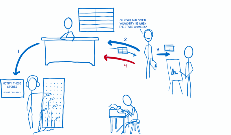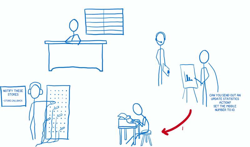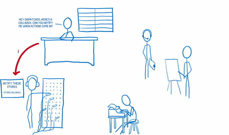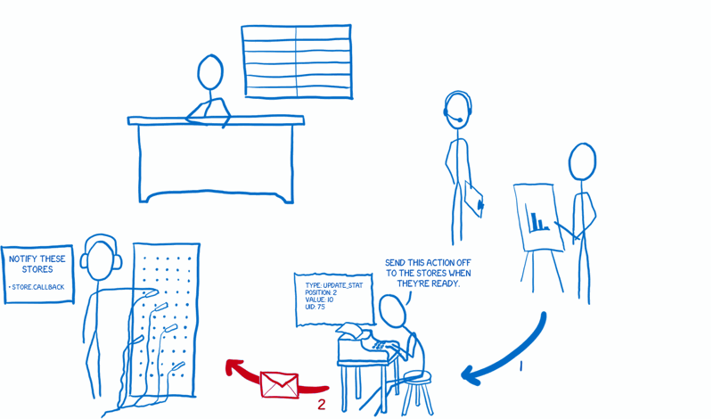 3. 디스패처는 순차적으로 매장에 작업을 보냅니다. 각 매장은 모든 작업에 대한 알림을 받습니다. 그런 다음 저장소는 이 항목에 관심이 있는지 여부를 결정하고 그에 따라 상태를 변경합니다.