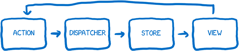 Store에서 View에게 상태가 변경되었음을 알려주면 최상위 View(Controller View)는 Store에서 데이터를 가져와 자식 View에게 내려보낸다. 새로운 데이터를 받은 View는 화면을 리렌더링 한다. 또한 사용자가 View에 어떠한 조작을 하면 그에 해당하는 Action을 생성한다.