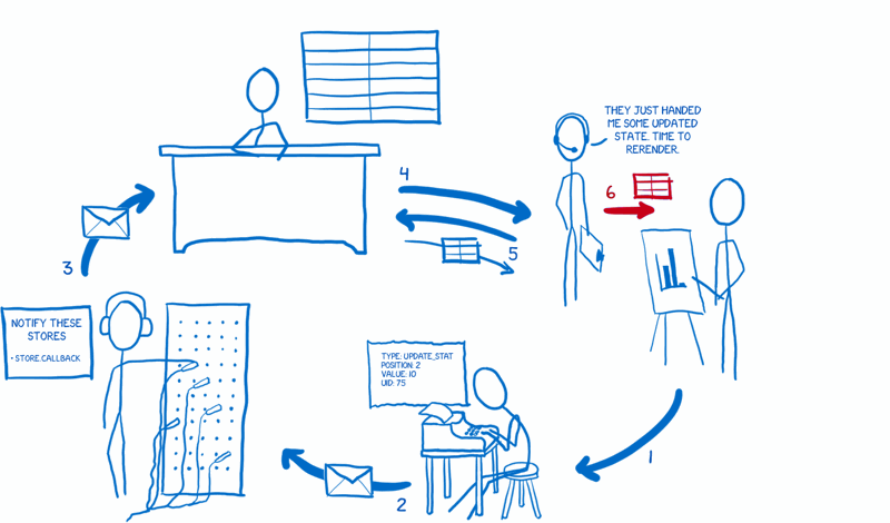6. 스토어가 상태를 제공한 후 뷰 컨트롤러는 하위 뷰에 새 상태를 기반으로 다시 렌더링하도록 지시합니다.