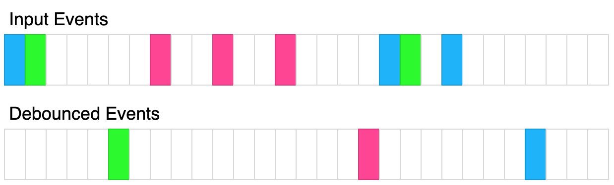 The above diagram shows how debounce will transform events. Each rectangle represents 100ms and the debounce time is 400ms. Each color represents a different set of inputs.