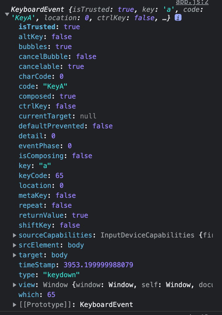 키보드 이벤트를 console 에서 찍어보면 이렇게 나오는데