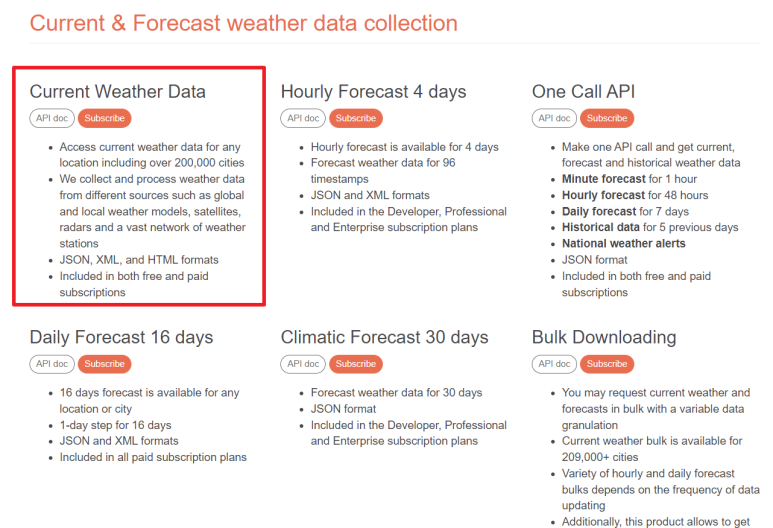 우리는 위치에 대한 현재 날씨 정보를 얻기위해 Current Weather Data를 사용할 거다