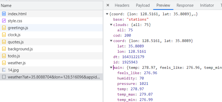 날씨, 온도 정보 등등을 가져오는걸 확인할 수 있다.