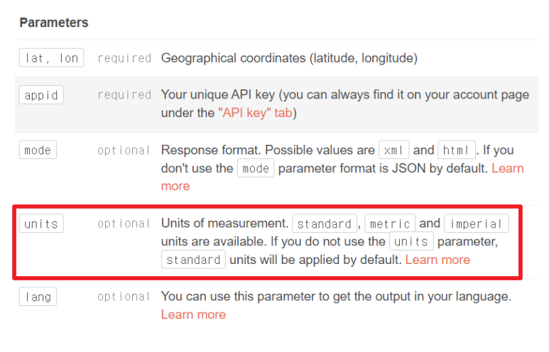 url 마지막에 &units=metric를 추가하여 다음과 같이 작성한다.