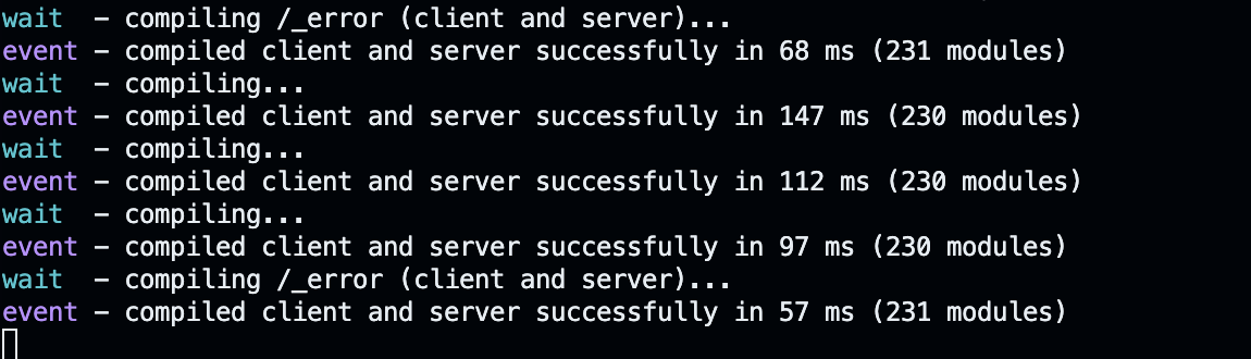 npm run dev로 next.js 앱을 실행하면 terminal 창에서는 client와 server가 실햄됨이 보인다.