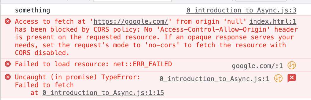 무언가를 가져오는데는 실패했지만, console.log로 찍은 something이라는 문자가 찍히고 난 다음 fetch가 실패했다는 메세지를 보여주고 있다.