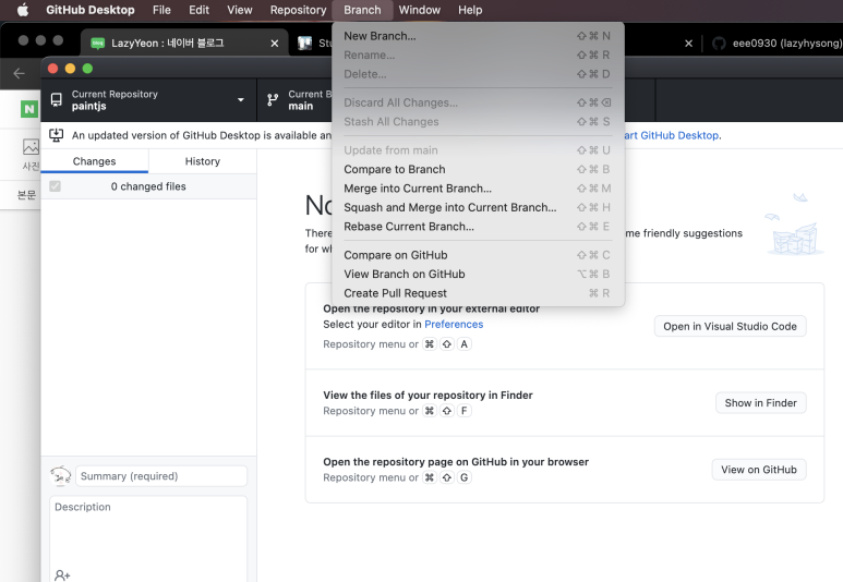 이제 master branch에 가서 맨위 Branch 탭을 누르고 Mergy into Current Branch를 누른다
