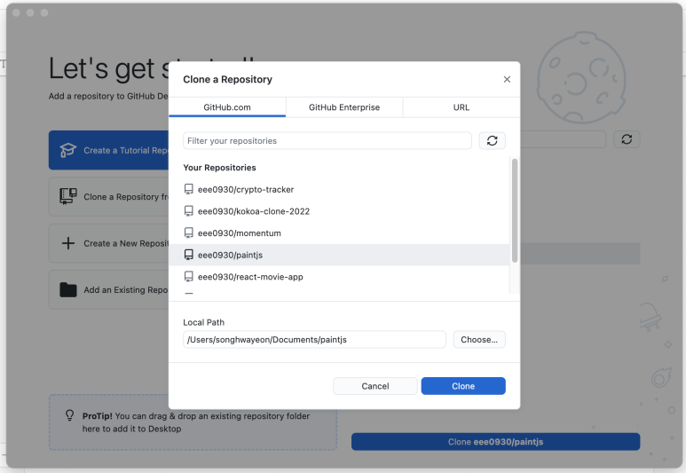 Clone a repository from the internet (인터넷에 있는 repositoy 복제하기) 를 누르면
