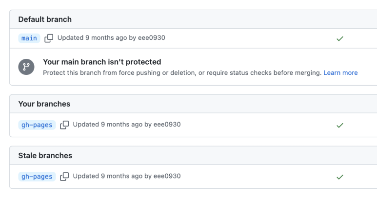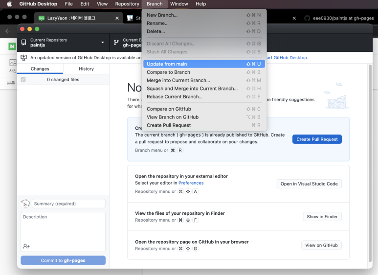 -> gh-pages로 이동 -> branch 탭에서 Update from main 클릭 -> 변경사항 Publish