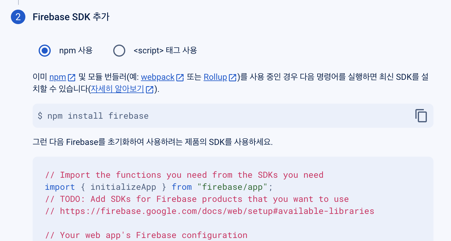 앱 등록을 클릭해주면 이제 firebase 설치를 위해 우리가 해야할 일을 알려준다.