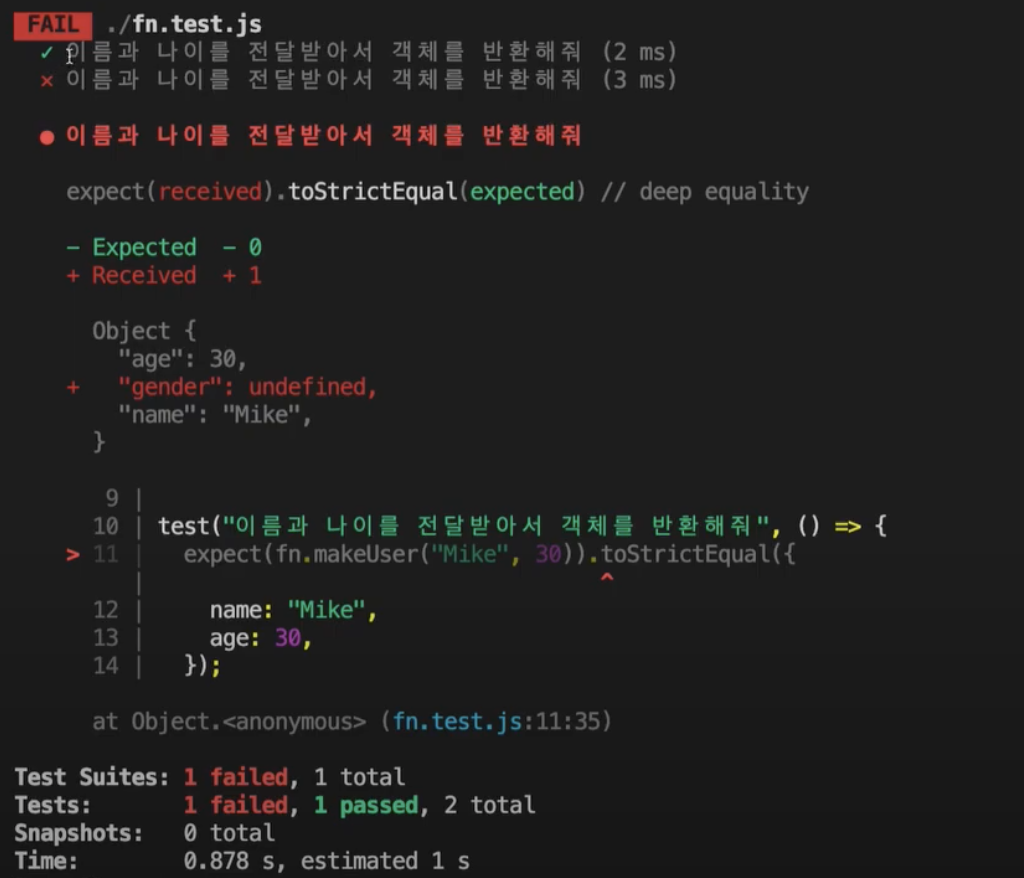 결과는 toStrictEqual을 쓴 test가 실패하게 된다.