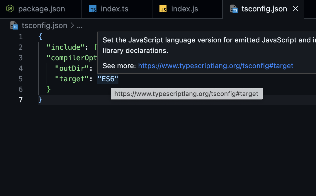 tsconfig에서 작성한 target에 마우스를 가져다 대면 툴팁 안에 링크가 보이는데, 함 클릭해보자!